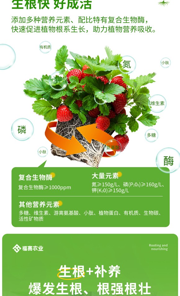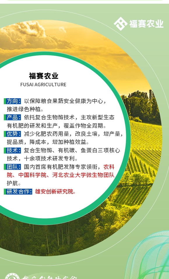 依托自主高新技術(shù)—復(fù)合生物酶技術(shù)緊隨國(guó)家綠色高品質(zhì)農(nóng)業(yè)發(fā)展政策和農(nóng)產(chǎn)品市場(chǎng)消費(fèi)升級(jí)趨勢(shì)福賽集團(tuán)注冊(cè)成立河北福賽農(nóng)業(yè)科技有限公司,以確保糧食果蔬健康為核心,以節(jié)肥增效、減藥控害為研發(fā)方向,聚焦新型有機(jī)肥的研發(fā)與生產(chǎn),為農(nóng)業(yè)增效,助農(nóng)民可持續(xù)性增收!截止目前,公司構(gòu)建了以生物發(fā)酵液體有機(jī)肥為核心的產(chǎn)品體系,包括魚蛋白肥系列