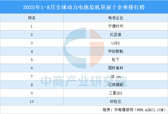 中商情報(bào)網(wǎng)訊:2025年1-8月,全球動(dòng)力電池裝機(jī)量約650.4GWh,同比增長34%。我國動(dòng)力電池裝機(jī)量占據(jù)全球62.4%的份額,排名前十企業(yè)占據(jù)六席。寧德時(shí)代排名第一,比亞迪、LGES位居第二個(gè)第三,中創(chuàng)新航、松下、國軒高科、SKon、億緯鋰能、三星SDI、欣旺達(dá)進(jìn)入前十,依次排名第4-10名。