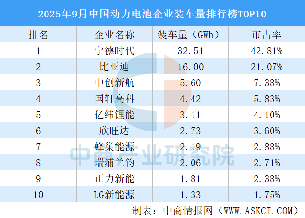中商情報(bào)網(wǎng)訊:9月,我國(guó)動(dòng)力電池裝車(chē)量76.0GWh,環(huán)比增長(zhǎng)21.6%,同比增長(zhǎng)39.5%。TOP10企業(yè)動(dòng)力電池裝車(chē)量合計(jì)71.76GWh,市占率合計(jì)94.51%。