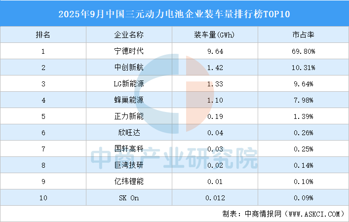寧德時(shí)代三元動力電池裝車量9.64GWh,市占率69.80%。中創(chuàng)新航、LG新能源三元動力電池裝車量分別為1.42GWh、1.33GWh,市占率分別為10.31%、9.64%。蜂巢能源、正力新能、欣旺達(dá)、國軒高科、巨灣技研、億緯鋰能、SK On進(jìn)入前十,依次排名第4-10名。