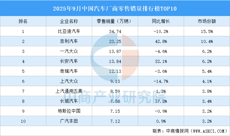 中商情報(bào)網(wǎng)訊:2025年9月,汽車零售銷量前十廠商零售銷量合計(jì)137.39萬輛,市場份額合計(jì)61.4%。比亞迪汽車零售銷量最高達(dá)34.74萬輛,市場份額15.5%。吉利汽車、一汽大眾排名第二和第三,零售銷量分別為23.25萬輛、13.87萬輛,市場份額分別為10.4%、6.2%。長安汽車、奇瑞汽車、上汽大眾、上汽通用五菱、長城汽車、特斯拉中國、廣汽豐田進(jìn)入前十,依次排名第4-10名。