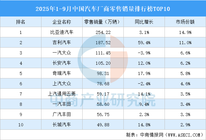 中商情報網(wǎng)訊:2025年1-9月,汽車零售銷量前十廠商零售銷量合計105.98萬輛,市場份額合計62.2%。比亞迪汽車零售銷量最高達254.22萬輛,市場份額14.9%。吉利汽車、一汽大眾排名第二和第三,零售銷量分別為187.52萬輛、111.45萬輛,市場份額分別為11.0%、6.6%。長安汽車、奇瑞汽車、上汽大眾、上汽通用五菱、一汽豐田、廣汽豐田、長城汽車進入前十,依次排名第4-10名。