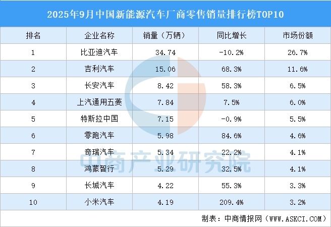 中商情報網(wǎng)訊:2025年9月,中國新能源汽車零售銷量前十廠商零售銷量合計98.24萬輛,市場份額75.6%。比亞迪汽車零售銷量最高達34.74萬輛,市場份額26.7%。吉利汽車、長安汽車排名第二和第三,零售銷量分別為15.06萬輛、8.42萬輛,市場份額分別為11.6%、6.5%。上汽通用五菱、特斯拉中國、零跑汽車、奇瑞汽車、鴻蒙智行、長城汽車、小米汽車進入前十,依次排名第4-10名。