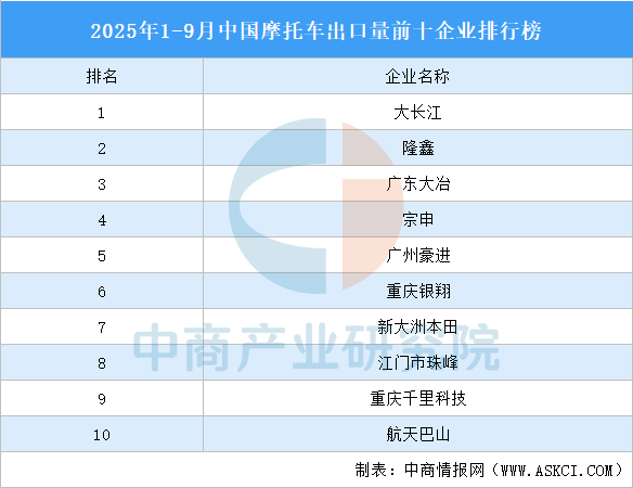 1-9月,摩托車出口量排名前十位的企業(yè)依次為:大長(zhǎng)江、隆鑫、廣東大冶、宗申、廣州豪進(jìn)、重慶銀翔、新大洲本田、江門市珠峰、重慶千里科技、航天巴山。