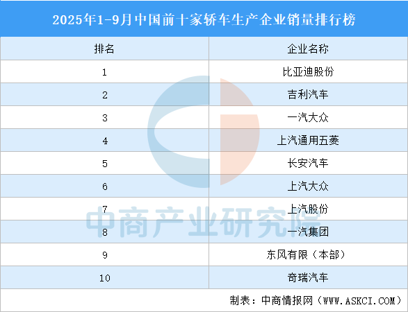 2025年1-9月中國(guó)汽車銷量前十企業(yè)(集團(tuán))排行榜(附榜單)