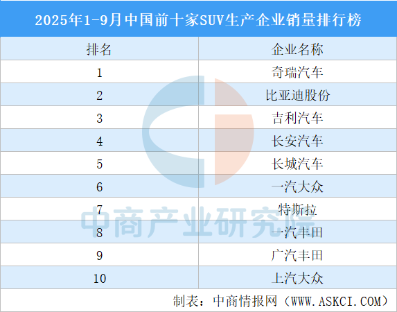 中商情報(bào)網(wǎng)訊:2025年1-9月,銷(xiāo)量排名前十位的SUV生產(chǎn)企業(yè)共銷(xiāo)售749.6萬(wàn)輛,占SUV銷(xiāo)售總量的66.5%。其中,奇瑞汽車(chē)銷(xiāo)量最高,比亞迪股份、吉利汽車(chē)位居第二和第三,長(zhǎng)安汽車(chē)、長(zhǎng)城汽車(chē)、一汽大眾、特斯拉、一汽豐田、廣汽豐田、上汽大眾進(jìn)入前十,依次排名第4-10名。