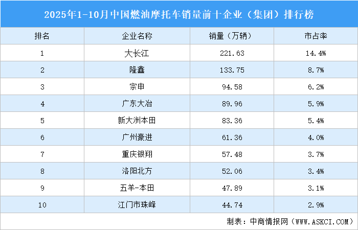 中商情報網(wǎng)訊:1-10月,全行業(yè)完成燃油摩托車銷量1534.28萬輛,同比增長12.92%。TOP10企業(yè)摩托車銷量合計886.81萬輛,市占率合計57.8%。