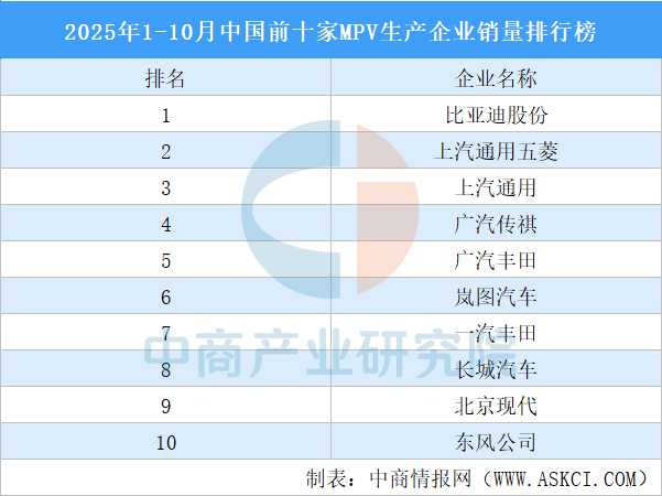 中商情報(bào)網(wǎng)訊:1-10月,銷(xiāo)量排名前十位的MPV生產(chǎn)企業(yè)共銷(xiāo)售77萬(wàn)輛,占MPV銷(xiāo)售總量的77.9%。比亞迪股份銷(xiāo)量最高,上汽通用五菱、上汽通用排名第二和第三,廣汽傳祺、廣汽豐田、嵐圖汽車(chē)、一汽豐田、長(zhǎng)城汽車(chē)、北京現(xiàn)代、東風(fēng)公司進(jìn)入前十,依次排名第4-10名。
