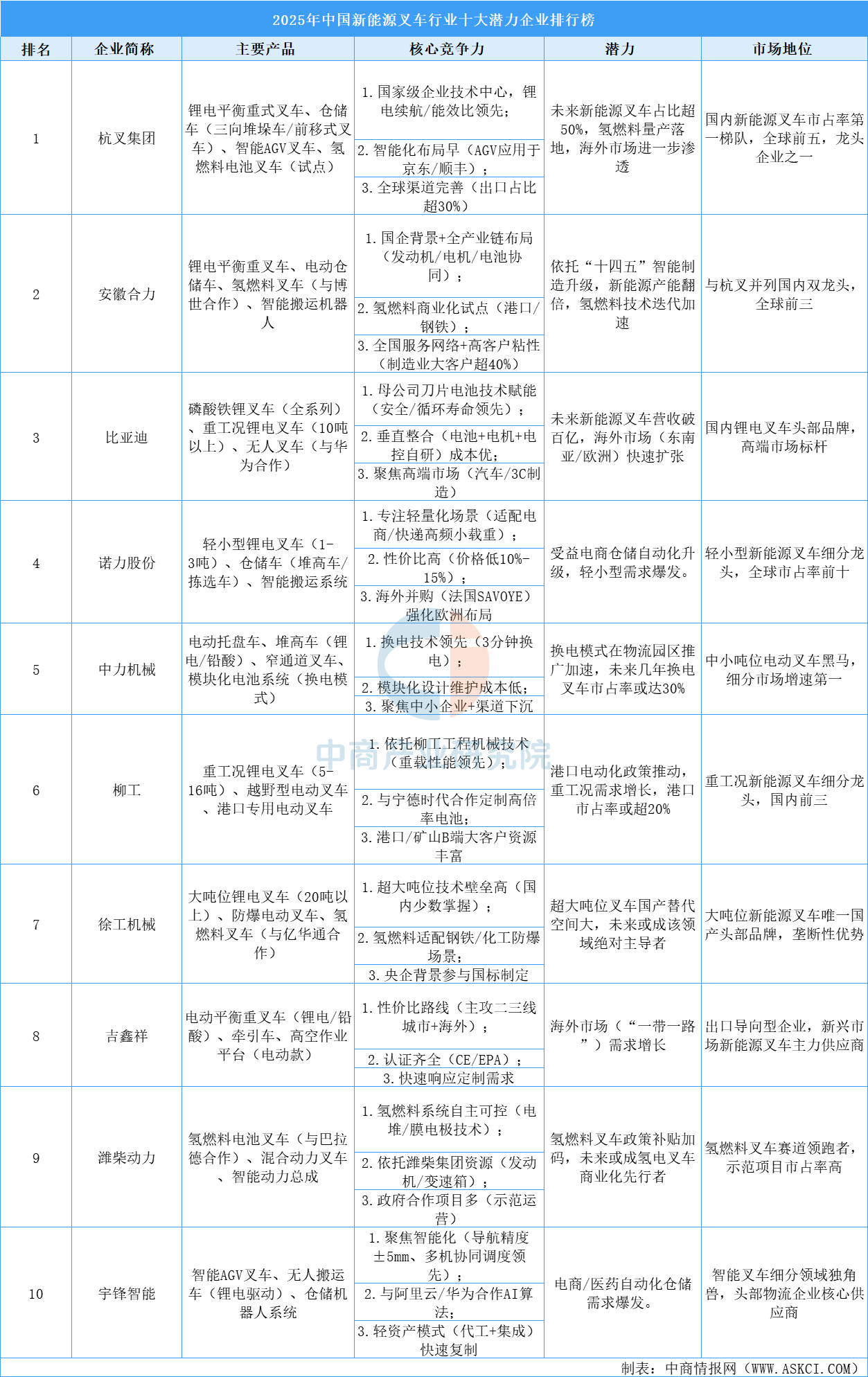 中商情報網(wǎng)訊:2025年中國新能源叉車行業(yè)十大潛力企業(yè)分別為:杭叉集團、安徽合力、比亞迪、諾力股份、中力機械、柳工、徐工機械、吉鑫祥、濰柴動力、宇鋒智能。