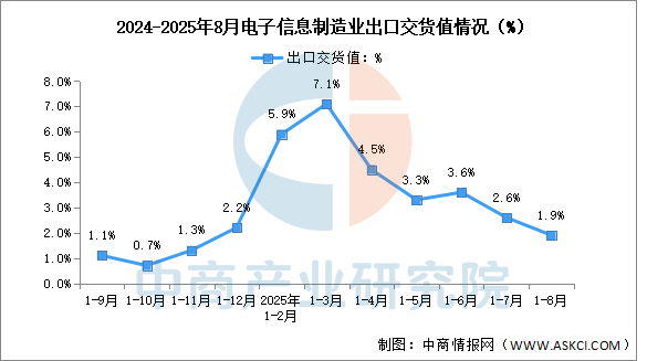 1—8月,規(guī)模以上電子信息制造業(yè)累計(jì)實(shí)現(xiàn)出口交貨值同比增長(zhǎng)1.9%,較1—7月回落0.7個(gè)百分點(diǎn)。8月份,規(guī)模以上電子信息制造業(yè)實(shí)現(xiàn)出口交貨值同比下降2.6%。