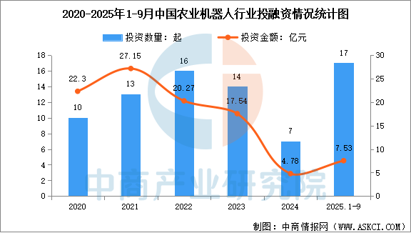 中商情報(bào)網(wǎng)訊:2025年我國(guó)農(nóng)業(yè)機(jī)器人行業(yè)呈現(xiàn)投融資活躍態(tài)勢(shì),AI與核心零部件領(lǐng)域成資本熱點(diǎn),融資事件數(shù)量大幅增長(zhǎng)。中商產(chǎn)業(yè)研究院發(fā)布的《2025-2030年中國(guó)農(nóng)業(yè)機(jī)器人深度分析及發(fā)展前景研究預(yù)測(cè)報(bào)告》顯示,2025年1-9月中國(guó)農(nóng)業(yè)機(jī)器人行業(yè)相關(guān)投融資事件數(shù)量達(dá)到17起,投融資金額達(dá)到7.53億元。