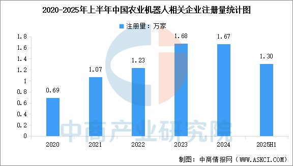 國(guó)家持續(xù)推動(dòng)農(nóng)業(yè)機(jī)械化、智能化發(fā)展,出臺(tái)了一系列扶持政策,如農(nóng)機(jī)購置補(bǔ)貼、稅收優(yōu)惠等,為農(nóng)業(yè)機(jī)器人相關(guān)企業(yè)提供了良好的發(fā)展環(huán)境,中國(guó)農(nóng)業(yè)機(jī)械相關(guān)企業(yè)注冊(cè)量基本逐年增加。中商產(chǎn)業(yè)研究院發(fā)布的《2025-2030年中國(guó)農(nóng)業(yè)機(jī)器人深度分析及發(fā)展前景研究預(yù)測(cè)報(bào)告》顯示,2024年中國(guó)農(nóng)業(yè)機(jī)器人相關(guān)企業(yè)注冊(cè)量達(dá)到1.67萬家,2025年上半年農(nóng)業(yè)機(jī)器人相關(guān)企業(yè)注冊(cè)量已達(dá)到1.30萬家。