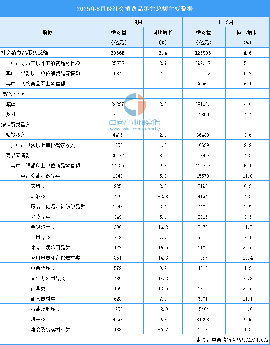 按消費類型分,8月份,商品零售額35172億元,同比增長3.6%;餐飲收入4496億元,增長2.1%。1—8月份,商品零售額287426億元,增長4.8%;餐飲收入36480億元,增長3.6%。