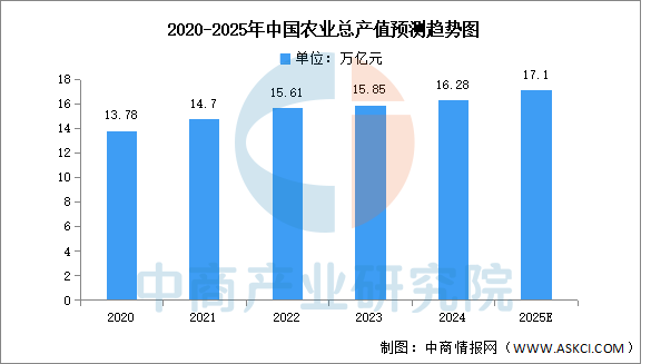 中國(guó)農(nóng)業(yè)正從大國(guó)邁向強(qiáng)國(guó),2024年農(nóng)林牧漁總產(chǎn)值達(dá)16.28萬(wàn)億元,農(nóng)業(yè)科技進(jìn)步貢獻(xiàn)率63.2%,農(nóng)作物耕種收綜合機(jī)械化率74.3%,良種覆蓋率超96%。中商產(chǎn)業(yè)研究院分析師預(yù)測(cè),2025年中國(guó)農(nóng)業(yè)總產(chǎn)值將超過17萬(wàn)億元。