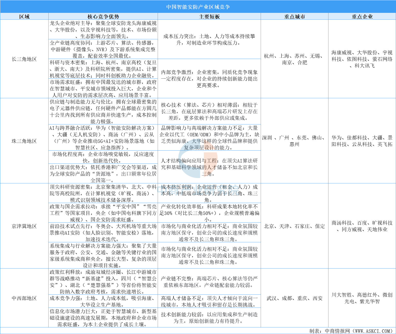 中國智能安防產(chǎn)業(yè)呈現(xiàn)明顯的區(qū)域競爭格局:長三角地區(qū)憑借??低?、大華股份等龍頭企業(yè)形成全產(chǎn)業(yè)鏈協(xié)同優(yōu)勢,科研與資本實力雄厚,但面臨成本上升與內(nèi)部同質(zhì)化競爭壓力;珠三角地區(qū)以高效供應(yīng)鏈和強大制造能力見長,市場反應(yīng)快、出口優(yōu)勢突出,但在核心算法與高端芯片研發(fā)、品牌影響力方面存在短板;京津冀地區(qū)依托頂尖高校資源和國家政策支持,引領(lǐng)算法與軟件創(chuàng)新,在系統(tǒng)集成與前沿技術(shù)試點上表現(xiàn)強勢,但產(chǎn)業(yè)化轉(zhuǎn)化效率較低、商業(yè)活力不足;中西部地區(qū)則受益于政策紅利與成本優(yōu)勢,市場需求增長迅速,但產(chǎn)業(yè)鏈不完整、高端人才缺乏制約其技術(shù)創(chuàng)新能力。