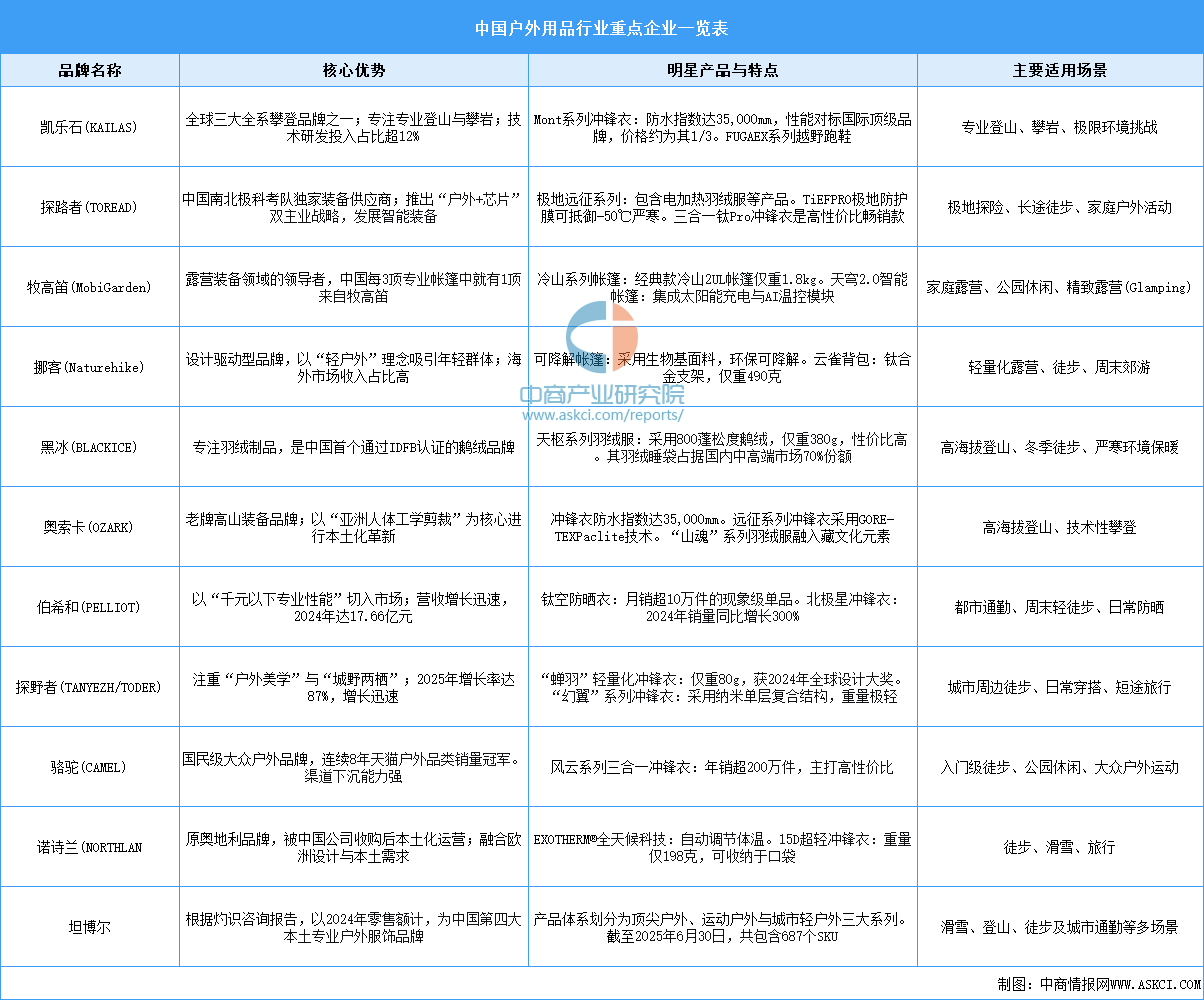 從企業(yè)來看,專業(yè)領(lǐng)域由凱樂石和探路者等為代表,它們以自主研發(fā)的尖端科技構(gòu)筑核心壁壘。大眾及新興市場中,伯希和憑借“千元以下專業(yè)性能”的定位,營收三年增長超三倍;駱駝則依托強大的渠道能力,連續(xù)多年蟬聯(lián)電商平臺銷量冠軍。在細分賽道,牧高笛在帳篷市場占有率超35%,黑冰則主導了中高端羽絨睡袋市場。