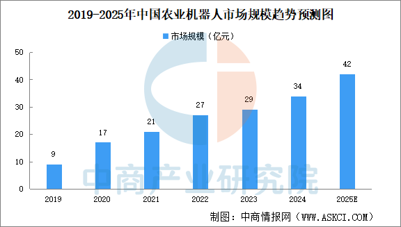 中商情報(bào)網(wǎng)訊:農(nóng)業(yè)機(jī)器人具有作業(yè)標(biāo)準(zhǔn)化和自動化的顯著特點(diǎn),在傳統(tǒng)機(jī)械化的基礎(chǔ)上,融合了傳感器技術(shù)、自動控制技術(shù)、機(jī)器視覺技術(shù),以及AI等前沿技術(shù),這使得農(nóng)業(yè)機(jī)器人能夠在非結(jié)構(gòu)化的農(nóng)業(yè)作業(yè)環(huán)境中高效工作。中商產(chǎn)業(yè)研究院發(fā)布的《2025-2030年全球及中國農(nóng)業(yè)機(jī)器人深度分析及發(fā)展前景研究預(yù)測報(bào)告》顯示,按照營收計(jì)算,我國農(nóng)業(yè)機(jī)器人市場規(guī)模由2019年的9億元增長至2024年的34億元,年均復(fù)合增長率29.8%。近年來,我國不斷加速農(nóng)業(yè)機(jī)械化進(jìn)程,提升現(xiàn)代農(nóng)業(yè)發(fā)展水平,農(nóng)業(yè)機(jī)器人的引入和應(yīng)用極大地改變了傳統(tǒng)耕作方式,在解決勞動力短缺問題上發(fā)揮了重要作用,并顯著提升生產(chǎn)效率,增加農(nóng)業(yè)產(chǎn)出。中商產(chǎn)業(yè)研究院分析師預(yù)測,2025年,中國農(nóng)業(yè)機(jī)器人市場規(guī)模將增至42億元。