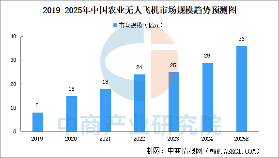 隨著中國農(nóng)業(yè)科技的不斷進步,無人機技術(shù)已經(jīng)成為完成現(xiàn)代農(nóng)業(yè)植後管理環(huán)節(jié)的重要工具。高效率的作業(yè)能力、精準(zhǔn)地施藥和施肥、減少農(nóng)作物損傷等優(yōu)勢,使得農(nóng)業(yè)無人飛機越來越廣泛地被應(yīng)用于農(nóng)田管理。按營收計,中國農(nóng)業(yè)無人飛機行業(yè)的市場規(guī)模由2019年的8億元增長至2024年的29億元,年均復(fù)合增長率29.3%。隨著無人機在能源續(xù)航、智能化等方面不斷取得技術(shù)突破,使其能夠應(yīng)用于更廣泛的場景。制造工藝的成熟也進一步降低了無人機的價格,促進了無人機的普及。中商產(chǎn)業(yè)研究院分析師預(yù)測,2025年中國農(nóng)業(yè)無人飛機行業(yè)市場規(guī)模將達36億元。
