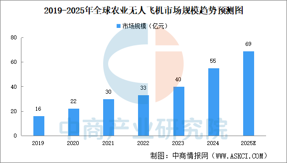 中商產(chǎn)業(yè)研究院發(fā)布的《2025-2030年全球及中國植保無人機市場調(diào)查與行業(yè)前景預(yù)測專題研究報告》顯示,按營收計,全球農(nóng)業(yè)無人飛機行業(yè)由2019年的16億元增長至2024年的55億元,年均復(fù)合增長率28.8%。農(nóng)業(yè)無人飛機行業(yè)的快速發(fā)展,推動了現(xiàn)代農(nóng)業(yè)節(jié)能、環(huán)保及高效發(fā)展趨勢。中商產(chǎn)業(yè)研究院分析師預(yù)測,2025年,全球農(nóng)業(yè)無人飛機行業(yè)市場規(guī)模將達69億元。