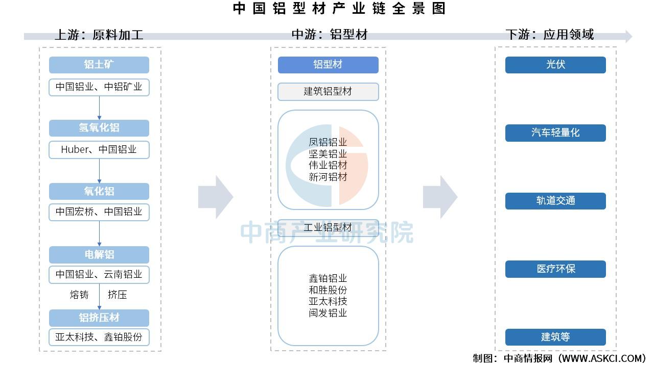 鋁型材產(chǎn)業(yè)鏈上游為原料加工,通過對鋁土礦進行加工,最后成為鋁擠壓材的過程;中游為鋁型材,可分為建筑鋁型材和工業(yè)鋁型材;下游應(yīng)用于光伏、汽車輕量化、軌道交通、醫(yī)療環(huán)保、建筑等。