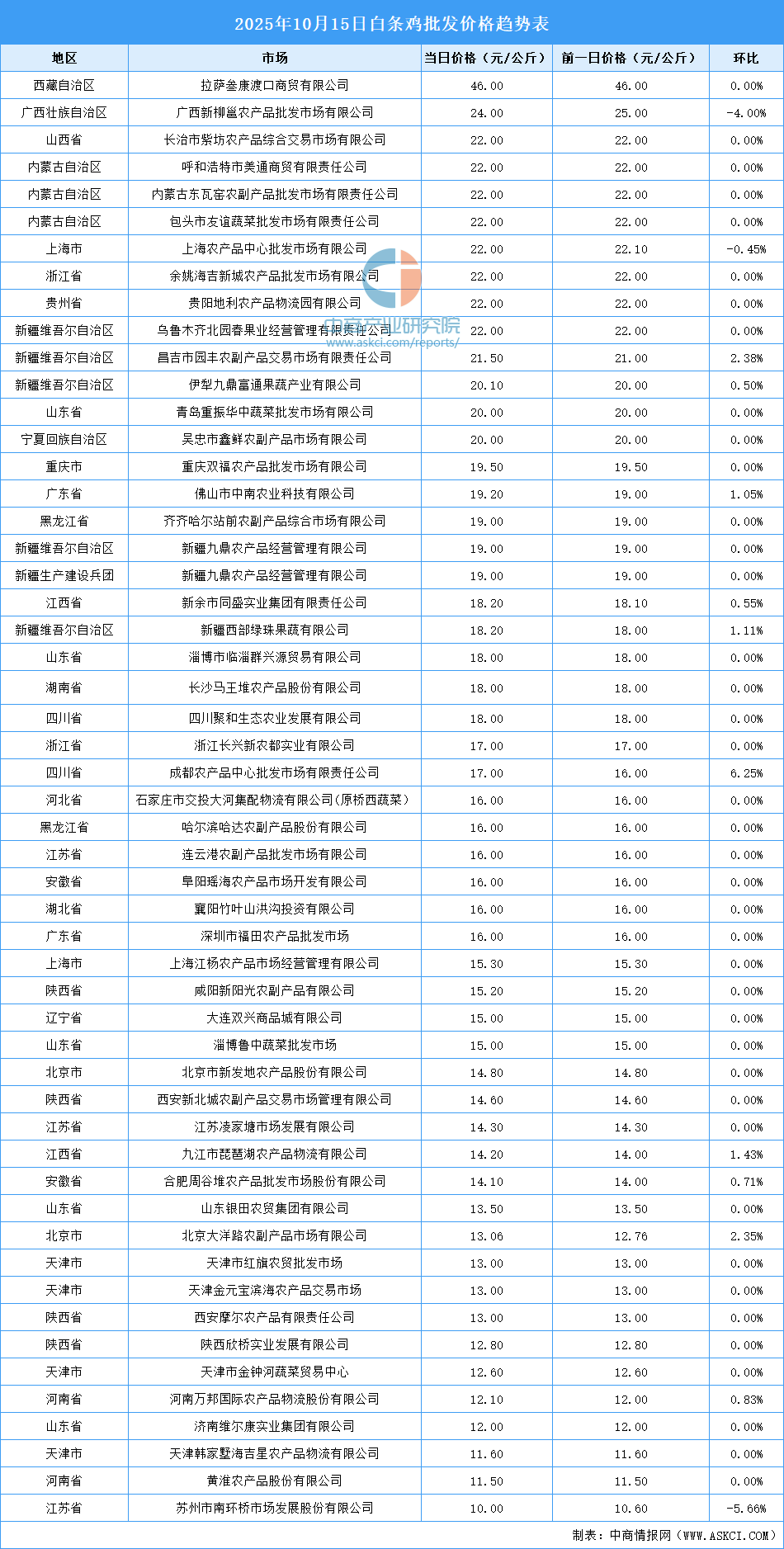 中商情報網(wǎng)訊:最新數(shù)據(jù)顯示:10月15日全國白條雞平均價格為17.44元/公斤。其中,白條雞價格最高的市場是拉薩叁康渡口商貿(mào)有限公司,當日價格為46.00元/公斤,環(huán)比持平。白條雞價格最低的市場是蘇州市南環(huán)橋市場發(fā)展股份有限公司,當日價格為10.00元/公斤,環(huán)比下跌5.66%。