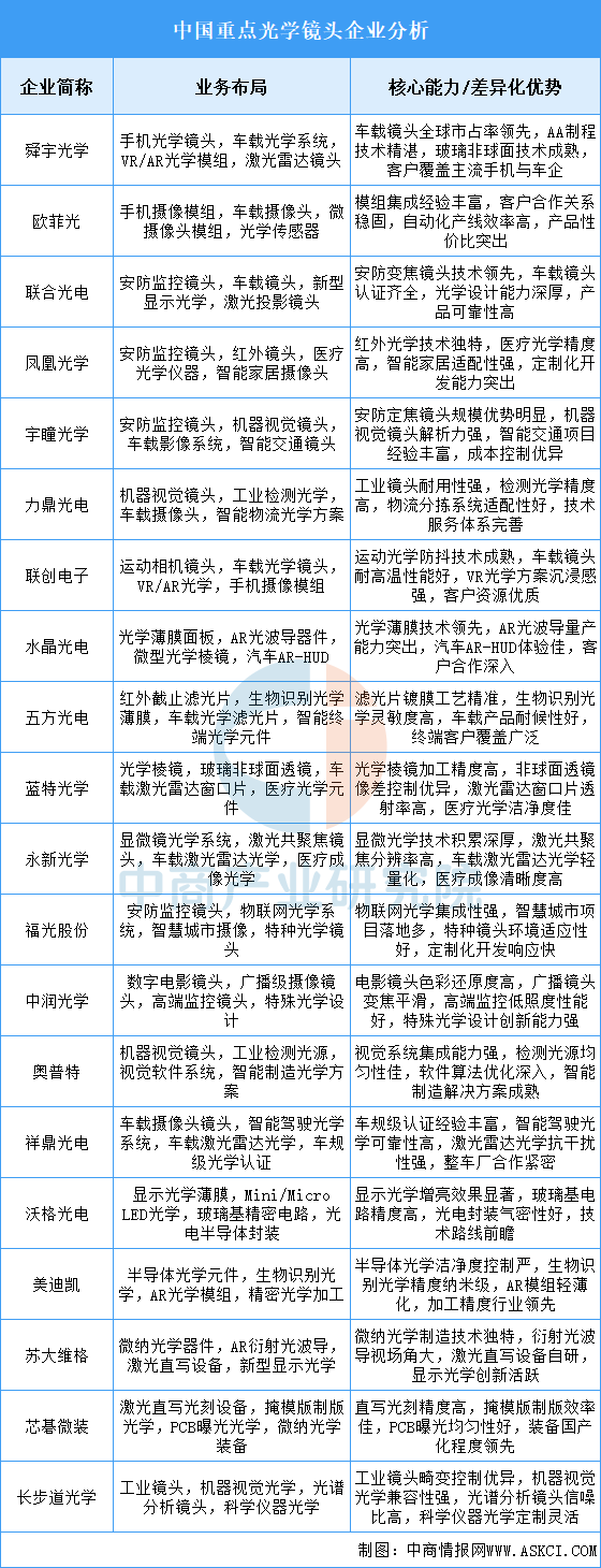 行業(yè)正經(jīng)歷從手機攝像向車載光學、AR/VR、機器視覺等多元應用領域快速拓展,技術(shù)競爭聚焦高像素、大光圈、小型化及新型光學材料應用,產(chǎn)業(yè)鏈從光學設計向模組集成與算法協(xié)同持續(xù)延伸。舜宇光學以手機與車載鏡頭雙輪驅(qū)動主導市場;歐菲光憑借模組集成能力鞏固客戶合作;聯(lián)合光電依托安防鏡頭技術(shù)深耕專業(yè)領域。