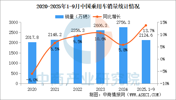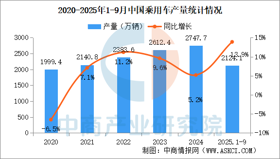 中商情報網(wǎng)訊:2025年9月,乘用車產(chǎn)銷分別完成290萬輛和285.9萬輛,環(huán)比分別增長16%和12.5%,同比分別增長15.9%和13.2%。2025年1-9月,乘用車產(chǎn)銷分別完成2124.1萬輛和2124.6萬輛,同比分別增長13.9%和13.7%。