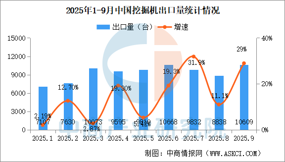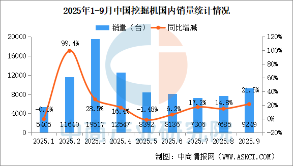 中商情報(bào)網(wǎng)訊:2025年9月銷售各類挖掘機(jī)19858臺(tái),同比增長(zhǎng)25.4%。其中國(guó)內(nèi)銷量9249臺(tái),同比增長(zhǎng)21.5%;出口量10609臺(tái),同比增長(zhǎng)29%。