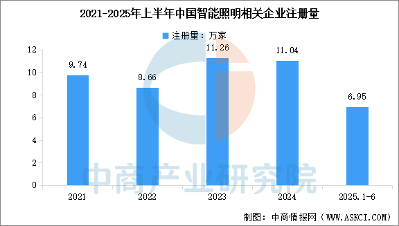 中商情報網(wǎng)訊:中國智能照明相關(guān)企業(yè)注冊量快速增長,顯示出強勁的行業(yè)吸引力和良好的發(fā)展前景。中商產(chǎn)業(yè)研究院發(fā)布的《2025-2030年全球及中國智能照明市場調(diào)查與行業(yè)前景預(yù)測專題研究報告》顯示,2024年中國智能照明相關(guān)企業(yè)注冊量達11.04萬家。2025年上半年,中國智能照明相關(guān)企業(yè)注冊量已達到6.95萬家。