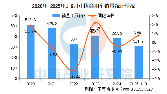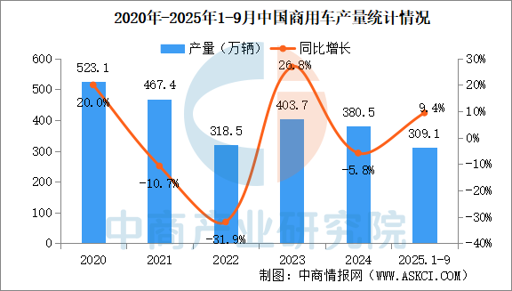 中商情報(bào)網(wǎng)訊:2025年9月,商用車產(chǎn)銷分別完成37.6萬輛和36.8萬輛,環(huán)比分別增長19.3%和16.3%,同比分別增長27.7%和29.6%。2025年1-9月,商用車產(chǎn)銷分別完成309.1萬輛和311.7萬輛,同比分別增長9.4%和7.8%。