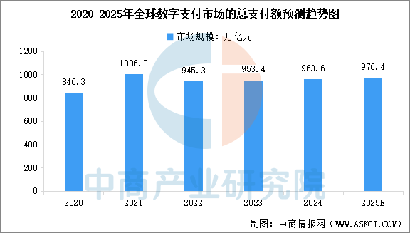 在數(shù)字支付工具廣泛普及與在線線下商業(yè)持續(xù)融合的推動下,全球數(shù)字支付市場自2020年起穩(wěn)步增長。中商產(chǎn)業(yè)研究院發(fā)布的《2025-2030年全球支付行業(yè)市場調(diào)研及投資前景預(yù)測報(bào)告》顯示,2020年至2024年全球數(shù)字支付的總支付額從846.3萬億元增長至963.6萬億元,復(fù)合年增長率達(dá)3.3%。中商產(chǎn)業(yè)研究院分析師預(yù)測,2025年全球數(shù)字支付的總支付額將達(dá)到976.4萬億元。