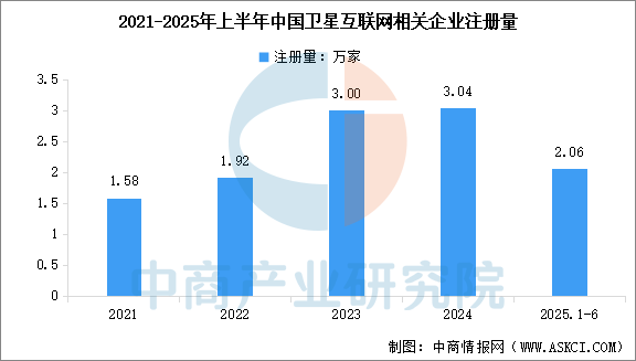 中國(guó)的衛(wèi)星互聯(lián)網(wǎng)產(chǎn)業(yè)正處在高速發(fā)展期,相關(guān)企業(yè)的注冊(cè)數(shù)量增長(zhǎng)迅猛。中商產(chǎn)業(yè)研究院發(fā)布的《2025-2030年中國(guó)衛(wèi)星互聯(lián)網(wǎng)行業(yè)市場(chǎng)發(fā)展現(xiàn)狀及投資規(guī)劃建議報(bào)告》顯示,2024年中國(guó)衛(wèi)星互聯(lián)網(wǎng)相關(guān)企業(yè)注冊(cè)量達(dá)到3.04萬(wàn)家,2025年上半年,衛(wèi)星互聯(lián)網(wǎng)相關(guān)企業(yè)注冊(cè)量已達(dá)到2.06萬(wàn)家。