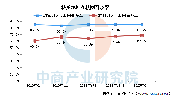 截至2025年6月,我國城鎮(zhèn)地區(qū)互聯(lián)網(wǎng)普及率為84.9%;農(nóng)村地區(qū)互聯(lián)網(wǎng)普及率為69.2%,較2024年12月提升1.9個(gè)百分點(diǎn)。