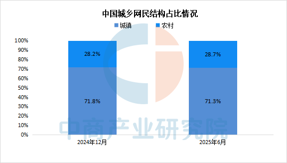 中商情報(bào)網(wǎng)訊:截至2025年6月,我國城鎮(zhèn)網(wǎng)民規(guī)模達(dá)8.01億人,占網(wǎng)民整體的71.3%;農(nóng)村網(wǎng)民規(guī)模達(dá)3.22億人,占網(wǎng)民整體的28.7%。
