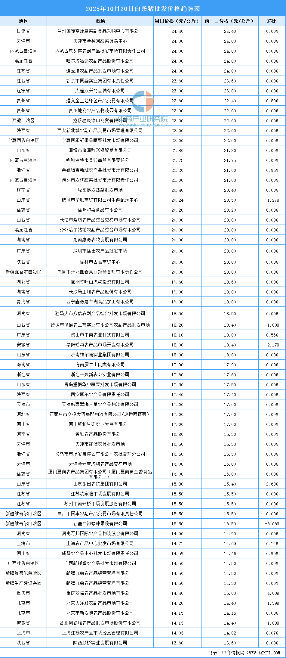 中商情報網(wǎng)訊:最新數(shù)據(jù)顯示:10月20日全國白條豬平均價格為18.48元/公斤。其中,白條豬價格最高的市場是蘭州國際高原夏菜副食品采購中心有限公司,當(dāng)日價格為24.40元/公斤,環(huán)比持平。白條豬價格最低的是陜西欣橋?qū)崢I(yè)發(fā)展有限公司,當(dāng)日價格為13.60元/公斤,環(huán)比持平。