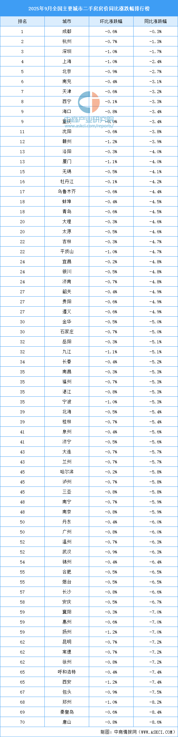 熱點(diǎn)城市中,成都二手房房價(jià)同比下降0.3%,杭州下降1.3%,???、重慶均下降3.4%,蘭州下降5.7%,三亞下降5.8%,南京下降5.9%,武漢下降6.3%,西安下降7.4%,鄭州下降8.2%。