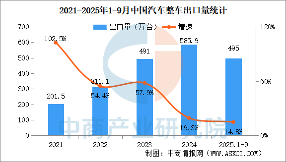 中商情報網(wǎng)訊:2025年9月,汽車出口65.2萬輛,環(huán)比增長6.7%,同比增長21%。2025年1-9月,汽車出口495萬輛,同比增長14.8%。