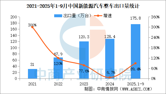 2025年9月,新能源汽車出口22.2萬輛,環(huán)比下降0.9%,同比增長1倍。2025年1-9月,新能源汽車出口175.8萬輛,同比增長89.4%。