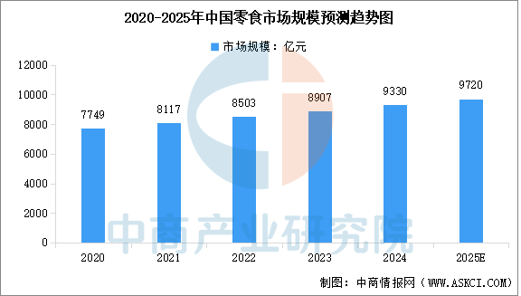中國是最大的零食市場之一。中商產(chǎn)業(yè)研究院發(fā)布的《2025-2030年中國食品行業(yè)發(fā)展研究報告》顯示,2020年中國零食行業(yè)市場規(guī)模為7749億元,2024年增長至9330億元,期間的復(fù)合年增長率為4.8%。在零食持續(xù)創(chuàng)新、對更健康食品的需求不斷增長以及渠道創(chuàng)新等因素的推動下,中商產(chǎn)業(yè)研究院分析師預(yù)測,2025年中國零食市場規(guī)模將增至9720億元。