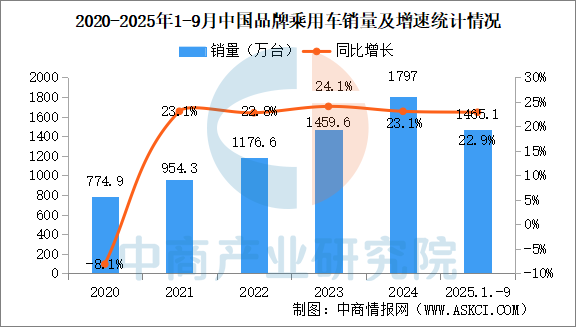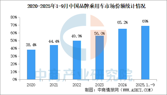 2025年1-9月,中國(guó)品牌乘用車共銷售1465.1萬(wàn)輛,同比增長(zhǎng)22.9%,占乘用車銷售總量的69%,銷量占有率比去年同期提升5.1個(gè)百分點(diǎn)。