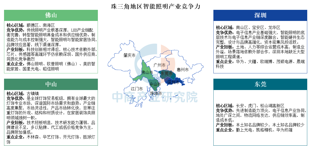 珠三角地區(qū)智能照明產業(yè)呈現出梯度化、協(xié)同發(fā)展的競爭格局。其中,中山憑借其全球燈飾貿易樞紐的地位,在家居裝飾照明領域以高度集聚的產業(yè)鏈和快速的市場轉化能力見長,但面臨技術研發(fā)薄弱和品牌附加值低的短板。佛山依托深厚的傳統(tǒng)照明根基和完善的LED產業(yè)鏈,在制造成本控制、品牌及線下渠道上優(yōu)勢顯著,并向智能家居領域延伸,但其核心技術與高端元件仍依賴外部。深圳則憑借強大的電子信息產業(yè)基礎,在智能照明的底層技術、高端設計與資本投入上引領創(chuàng)新,但高昂的運營成本導致制造業(yè)外溢,進而使其場景落地依賴合作。而東莞以其頂尖的先進制造能力、高效的供應鏈和成本優(yōu)勢,為整個區(qū)域提供關鍵的制造支撐,但在品牌與研發(fā)環(huán)節(jié)上相對薄弱。