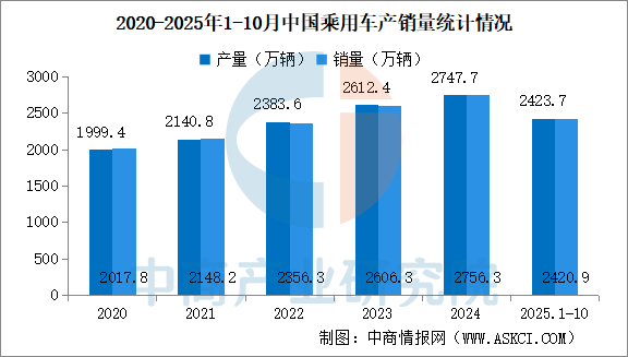 2025年10月,乘用車產(chǎn)銷分別完成299.5萬(wàn)輛和296.1萬(wàn)輛,環(huán)比分別增長(zhǎng)3.3%和3.6%,同比分別增長(zhǎng)10.7%和7.5%。2025年1-10月,乘用車產(chǎn)銷分別完成2423.7萬(wàn)輛和2420.9萬(wàn)輛,同比分別增長(zhǎng)13.5%和12.9%。