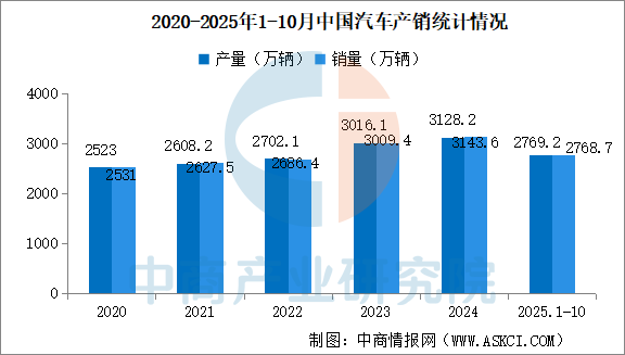 中商情報(bào)網(wǎng)訊:2025年10月,汽車產(chǎn)銷分別完成335.9萬(wàn)輛和332.2萬(wàn)輛,環(huán)比分別增長(zhǎng)2.5%和3%,同比分別增長(zhǎng)12.1%和8.8%。2025年1-10月,汽車產(chǎn)銷分別完成2769.2萬(wàn)輛和2768.7萬(wàn)輛,同比分別增長(zhǎng)13.2%和12.4%。