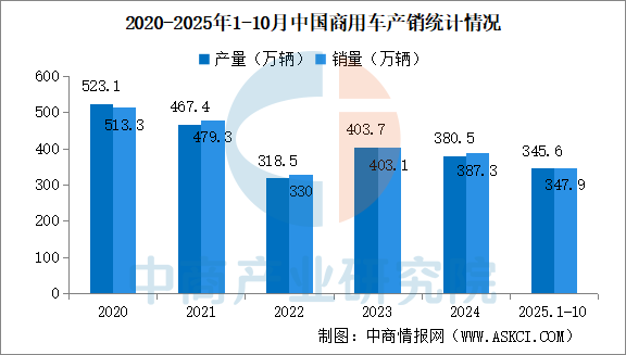 2025年10月,商用車產(chǎn)銷分別完成36.4萬(wàn)輛和36.1萬(wàn)輛,環(huán)比分別下降3.3%和1.9%,同比分別增長(zhǎng)25.4%和21%。2025年1-10月,商用車產(chǎn)銷分別完成345.6萬(wàn)輛和347.9萬(wàn)輛,同比分別增長(zhǎng)10.9%和9%。