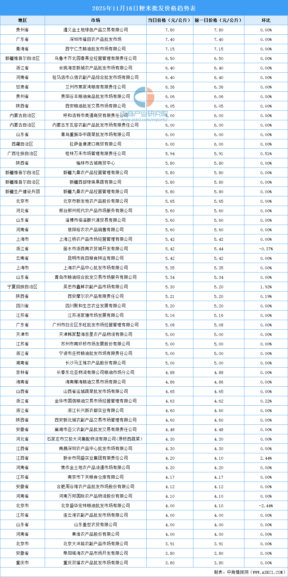 中商情報(bào)網(wǎng)訊:最新數(shù)據(jù)顯示:11月16日,全國粳米當(dāng)日均價(jià)為5.23元/公斤,秈米當(dāng)日均價(jià)4.89元/公斤。其中,粳米價(jià)格最高的遵義金土地綠色產(chǎn)品交易有限公司,當(dāng)日價(jià)格為7.8元/公斤,環(huán)比持平。秈米價(jià)格最高的市場是拉薩叁康渡口商貿(mào)有限公司,當(dāng)日價(jià)格為8.00元/公斤,環(huán)比持平。以下是2025年11月16日全國大米價(jià)格趨勢表詳情: