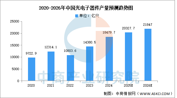 近年來,中國光電子器件產(chǎn)量整體呈上升趨勢。中商產(chǎn)業(yè)研究院發(fā)布的《2025-2030年中國光電子器件行業(yè)發(fā)展情況分析及投資前景預(yù)測報(bào)告》顯示,2024年中國光電子元器件產(chǎn)量達(dá)18479.7億只,較上年增長28.51%。中商產(chǎn)業(yè)研究院分析師預(yù)測,2025年中國光電子器件產(chǎn)量將超過20000億只,2026年產(chǎn)量將達(dá)21847億只。