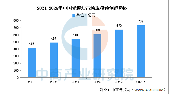 中國(guó)光模塊市場(chǎng)在政策支持和本土技術(shù)突破的雙重驅(qū)動(dòng)下,已成為全球增長(zhǎng)最快的區(qū)域。中商產(chǎn)業(yè)研究院發(fā)布的《2025-2030年中國(guó)光模塊行業(yè)市場(chǎng)前景預(yù)測(cè)及未來發(fā)展趨勢(shì)研究報(bào)告》顯示,2022年中國(guó)光模塊市場(chǎng)規(guī)模達(dá)489億元,同比增長(zhǎng)17.83%,2023年市場(chǎng)規(guī)模約為540億元,2024年約為606億元。中商產(chǎn)業(yè)研究院分析師預(yù)測(cè),隨著光模塊市場(chǎng)發(fā)展,2025年市場(chǎng)規(guī)模將達(dá)670億元,2026年有望超過700億元。