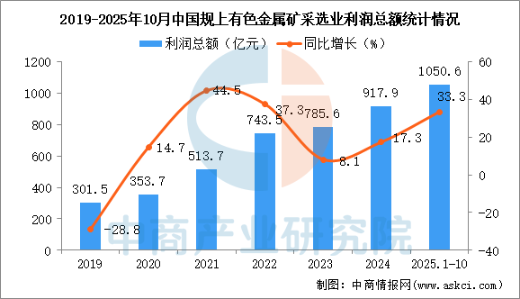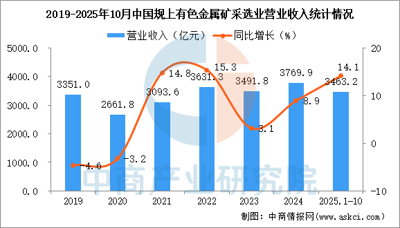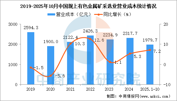 2025年1-10月,全國(guó)規(guī)模以上有色金屬礦采選業(yè)營(yíng)業(yè)收入3463.2億元,同比增長(zhǎng)14.1%;營(yíng)業(yè)成本1979.7億元,同比增長(zhǎng)7.2%;利潤(rùn)總額1050.6億元,同比增長(zhǎng)33.3%。