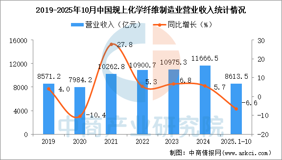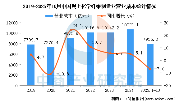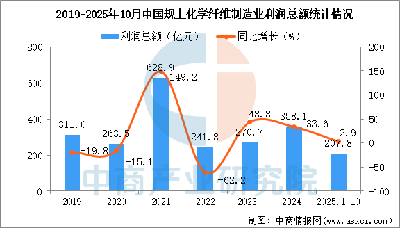 2025年1-10月,全國規(guī)模以上化學(xué)纖維制造業(yè)營業(yè)收入8613.5億元,同比下降6.6%;營業(yè)成本7955.3億元,同比下降7.0%;利潤總額207.8億元,同比增長2.9%。
