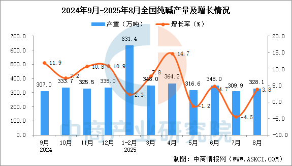 中商情報(bào)網(wǎng)訊:據(jù)中商產(chǎn)業(yè)研究院數(shù)據(jù)庫,2025年8月全國純堿當(dāng)月產(chǎn)量與去年同期相比增長。2025年8月全國純堿產(chǎn)量為328.1萬噸,同比增長3.8%。2025年1-8月全國純堿產(chǎn)量2625.4萬噸,同比增長3.4%。